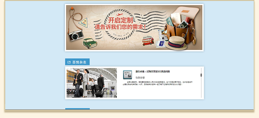 Project Description 百悦逸游于2012年初由二位资深的旅行家创办,是成都传媒集团旗下成都新闻国际旅行社有限公司的高端旅游品牌,总部位于成都高新区天府大道中段美年广场。在百悦逸游成立之前,创始团队亲自到全球三十多个国家实地考察,带着第一手的资讯和执着的信念创立了中国西部第一家真正意义上的私人定制旅行机构。百悦的旅行不是跟团挤大巴,不是十天去十个国家,更不是没完没了的... Official website address 白沙http://www.100.travel I want to share